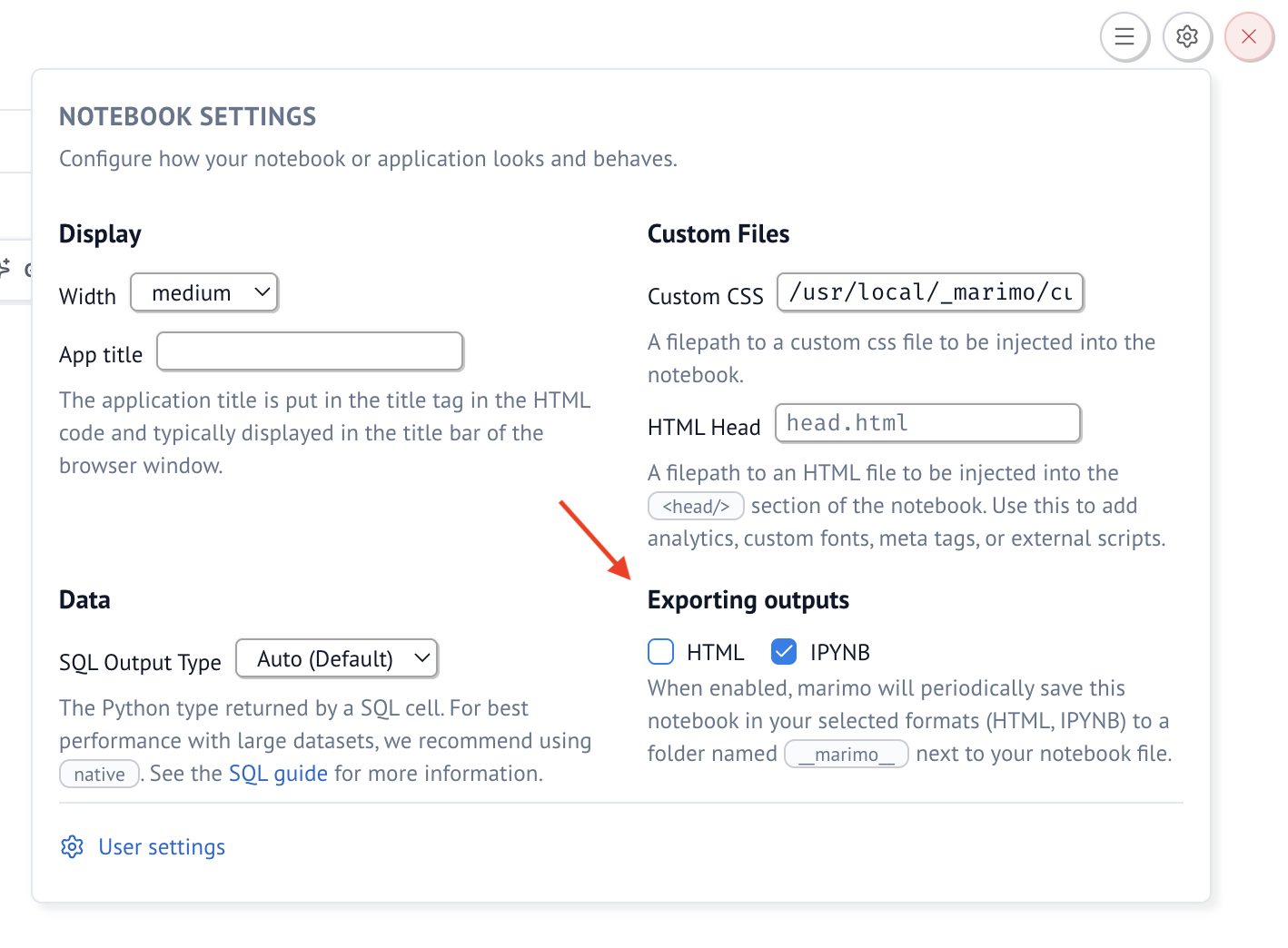 You can configure individual notebooks to automatically save as ipynb through the notebook menu. These automatic snapshots are saved to a folder called __marimo__ in the notebook directory.